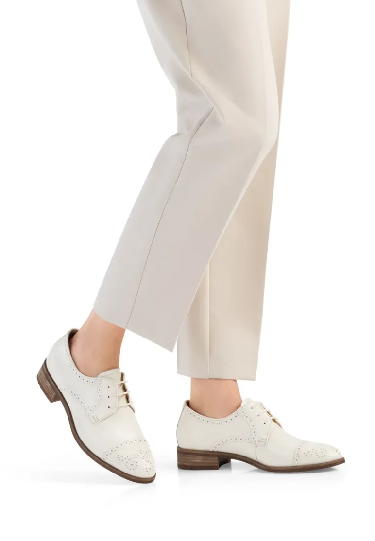 The LLOYD lace-up shoes crafted from white glazed leather feature a noble look. In these women’s shoes, a secure fit with lace fastening is a given. The non-slip rubber sole cushions the impact when walking and the leather of the inner sole contributes to good heat regulation. The pointed toe makes for an extravagant fit and gives an on-trend shape to the feet. Thanks to the low block heel the shoes offer secure footing and permit comfortable everyday wear. The laces as well as the classy glazed leather upper guarantee an elegant look and a firm, secure grip. These shoes are comfortable and breathable by use of the leather and textile lining.