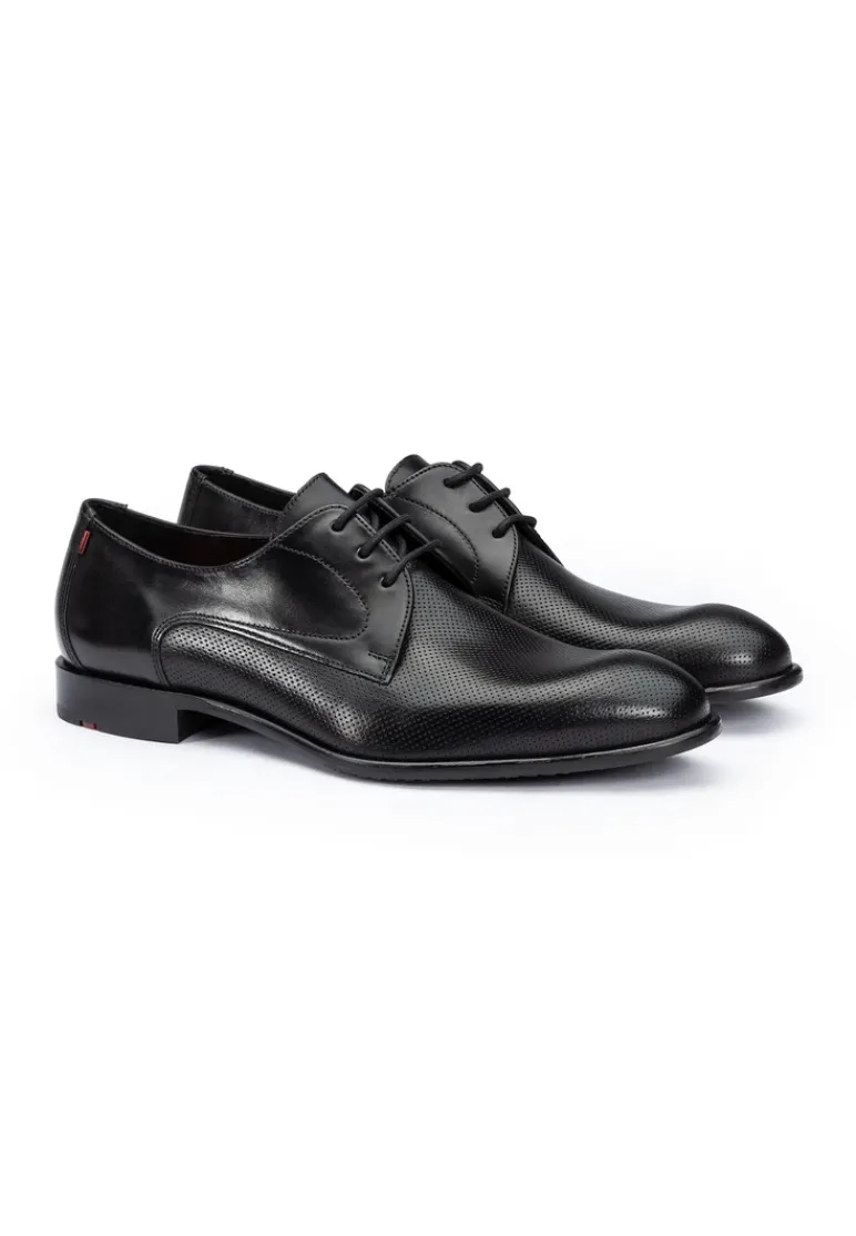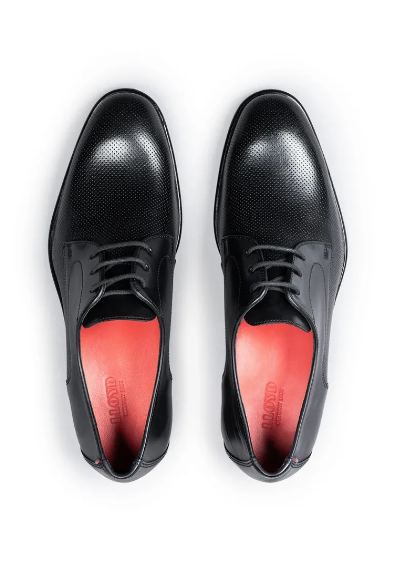 The RAPPORT Derby shoe from LLOYD impresses with its elegant design made from high-quality smooth leather and embossed leather. The lacing ensures an individual fit and a classic look, ideal for business and festive occasions. The round toe emphasizes the stylish silhouette and conveys timeless elegance. With a leather and rubber sole, this shoe combines comfort and style. The 100% leather lining adds to the elegant look and makes them comfortable to wear. In a classic black, this model fits harmoniously into any men’s shoe collection. The RAPPORT is the perfect choice for the modern man who values a well-groomed appearance. <p