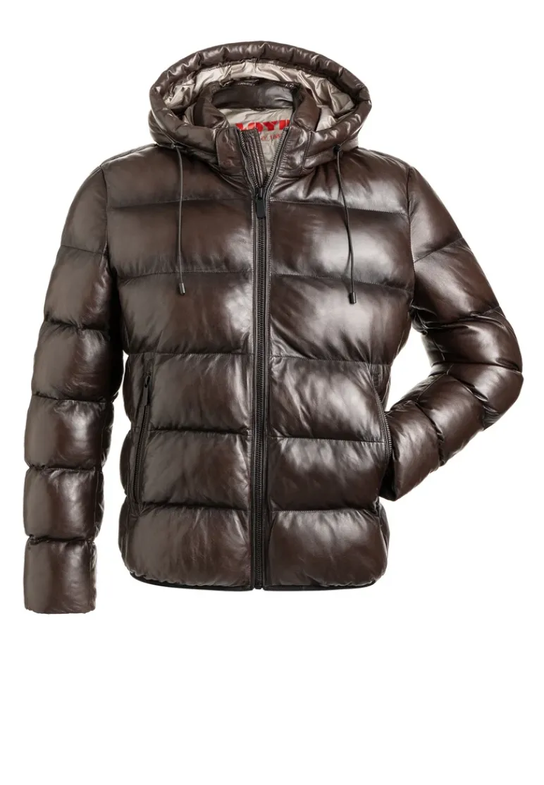 Discover the heavily padded quilted jacket made from sheep leather by LLOYD. This jacket features a high collar and a removable hood with adjustable width. Practical elements include front pockets with zippers and sturdy zippers. Inside, it offers two zippered pockets and an open pocket. The padding is processed in a chamber system and is made from sustainable Dupont Sorona Aura insulation. The model is 1.87 m tall and wears a size 50.n