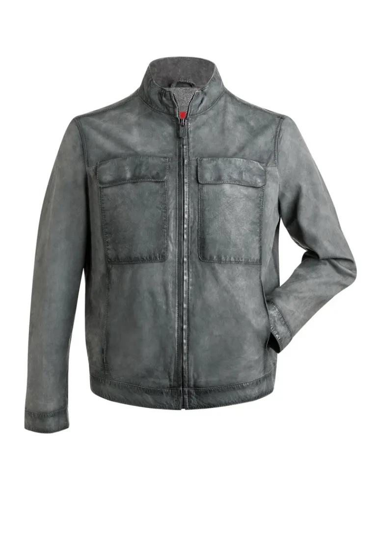 The LLOYD biker jacket with a stand-up collar, crafted from textured leather, features a slimmer fit and robust metal zippers. Two hand pockets and two chest pockets with snap closures provide practical storage. It includes an inner zip pocket, two open inner pockets, and a lining made from recycled Italian wool, combining sustainability with functionality. The model is 1.87 m tall and wears a size 50.n