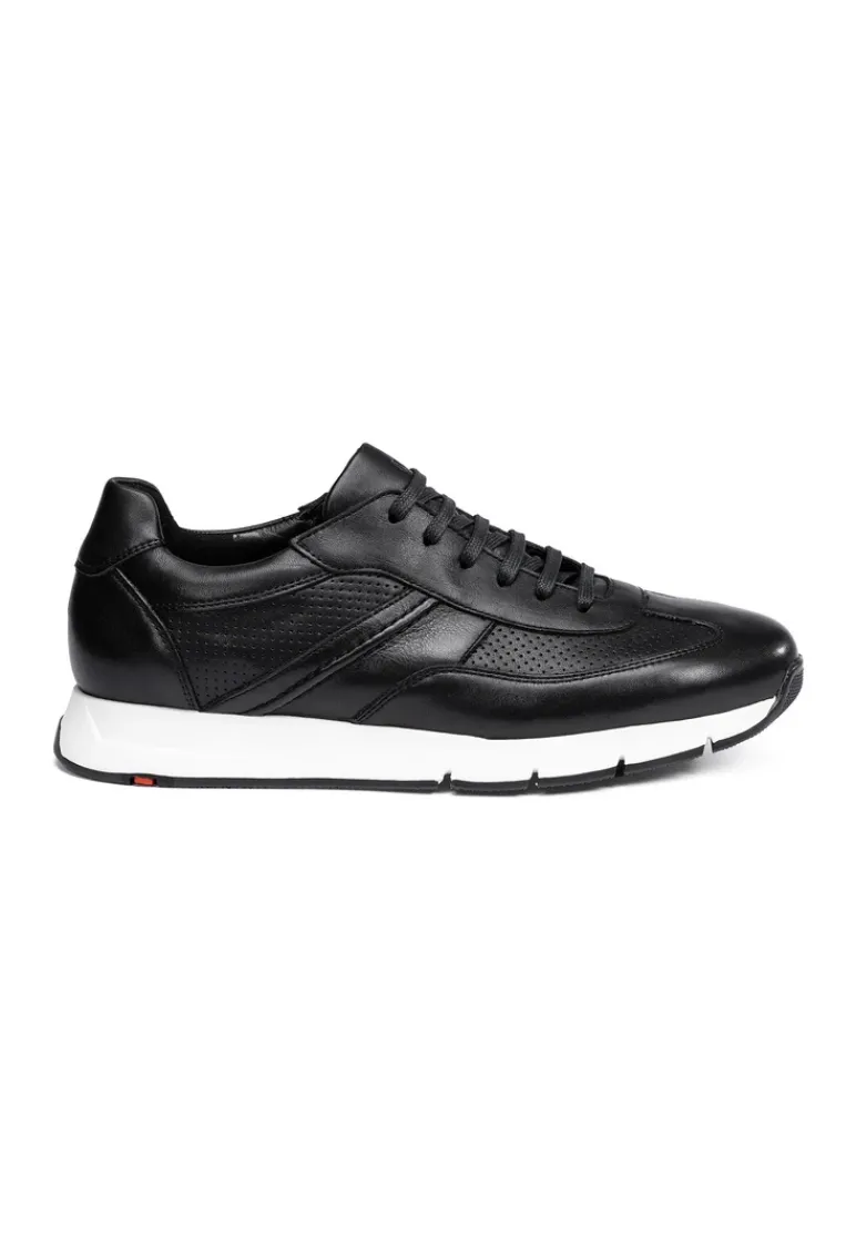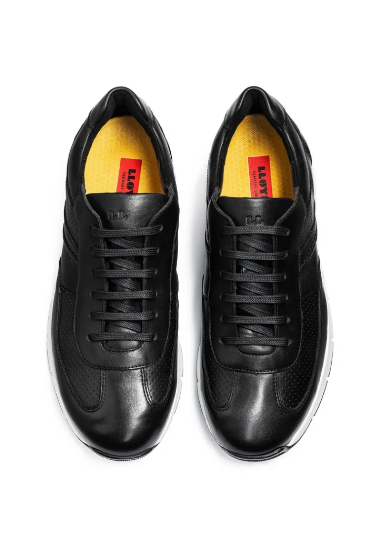 Stand out with the LLOYD trainers »ADLAY« made from black smooth leather and a sporty design. A sporty look for everyday life is guaranteed in these shoes. A wear-resistant rubber sole cushions the impact when walking and the synthetic of the inner sole contributes to lightness in wear. The laces and the stylish leather upper ensure a modern, high-quality appearance and a firm, secure grip. By use of the leather and textile lining these shoes are comfortable and breathable. The model has a Variofootbed so it is optimally suited for the use of inlays due to the removable insole.