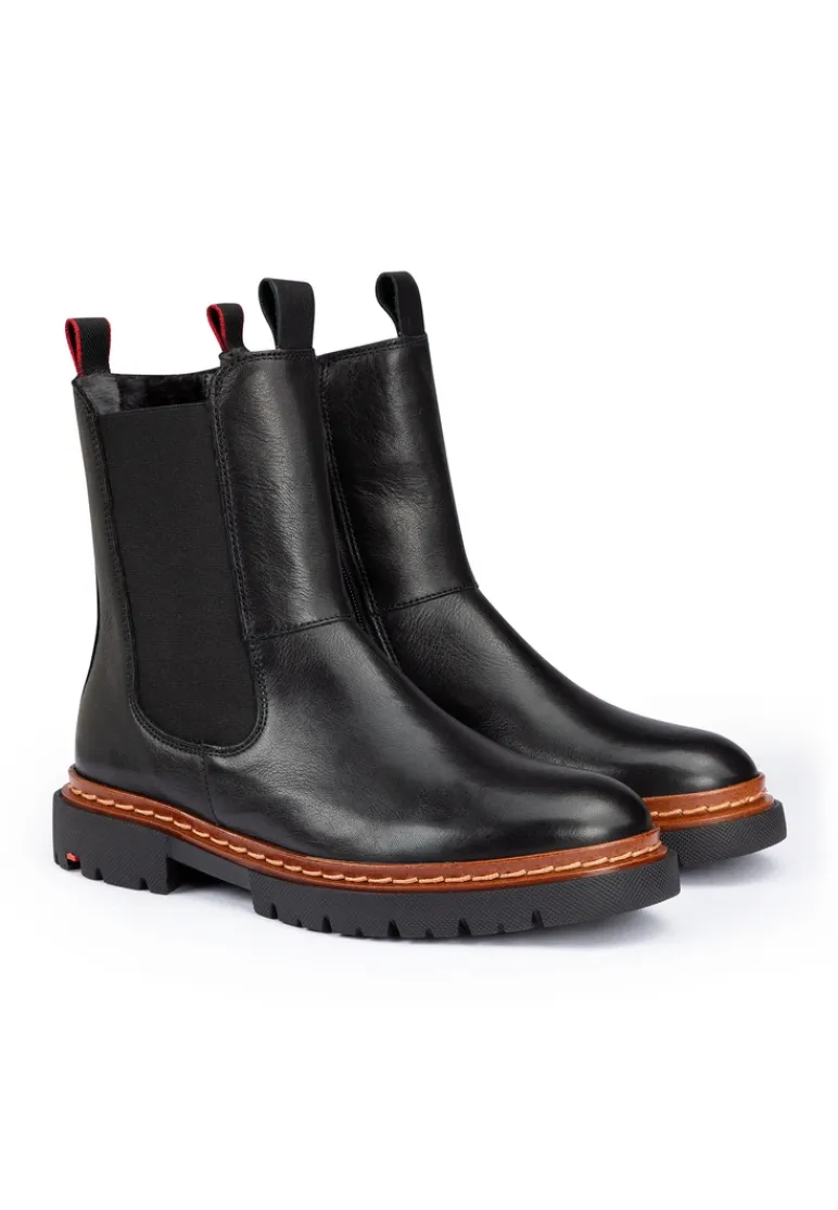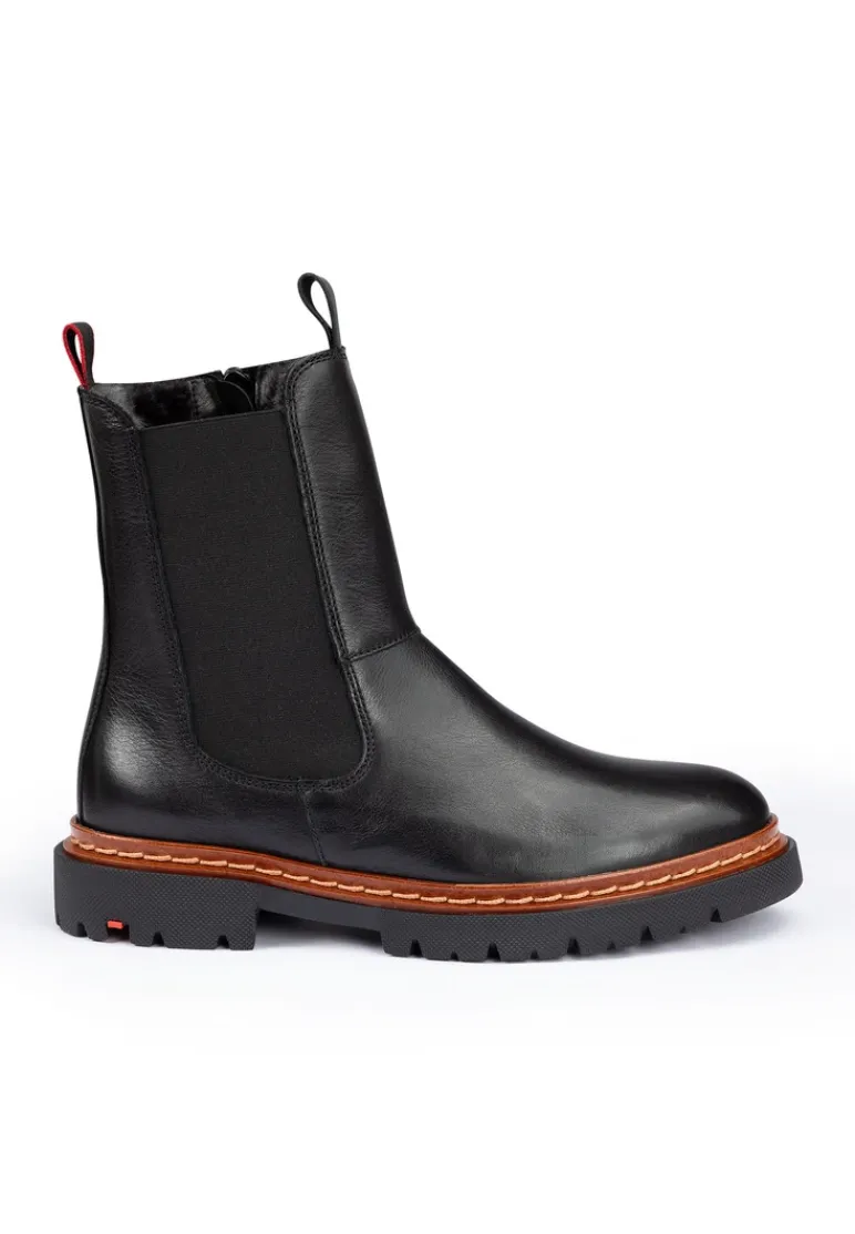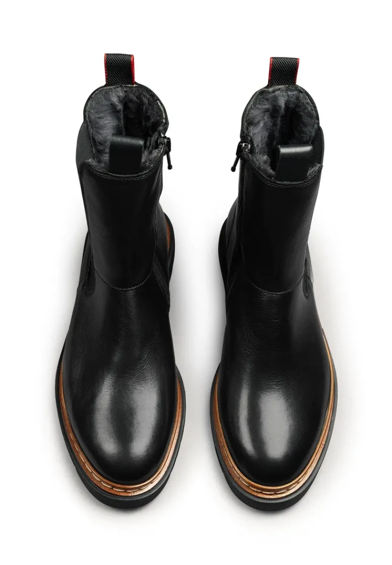 The LLOYD boot made from smooth black leather impresses with its durable and shock-absorbing sole. The ankle boots promise a versatile look that can be combined in many ways. The non-slip rubber sole provides ideal cushioning when walking. The lambskin insole provides a warm interior. Thanks to the flat block heel, these boots offer a secure foothold for everyday wear. The zipper and soft, smooth leather ensure an elegant look and easy closure. The lambskin-lined ankle boots are temperature-regulating and keep feet warm even on colder days.n
