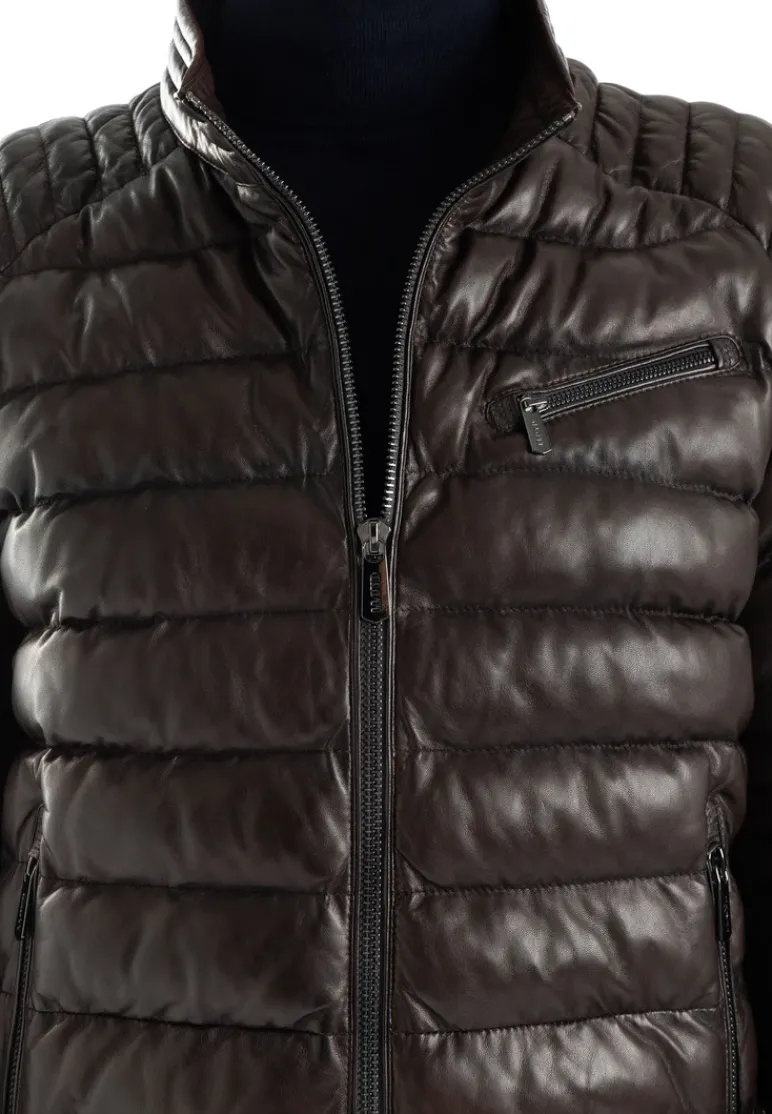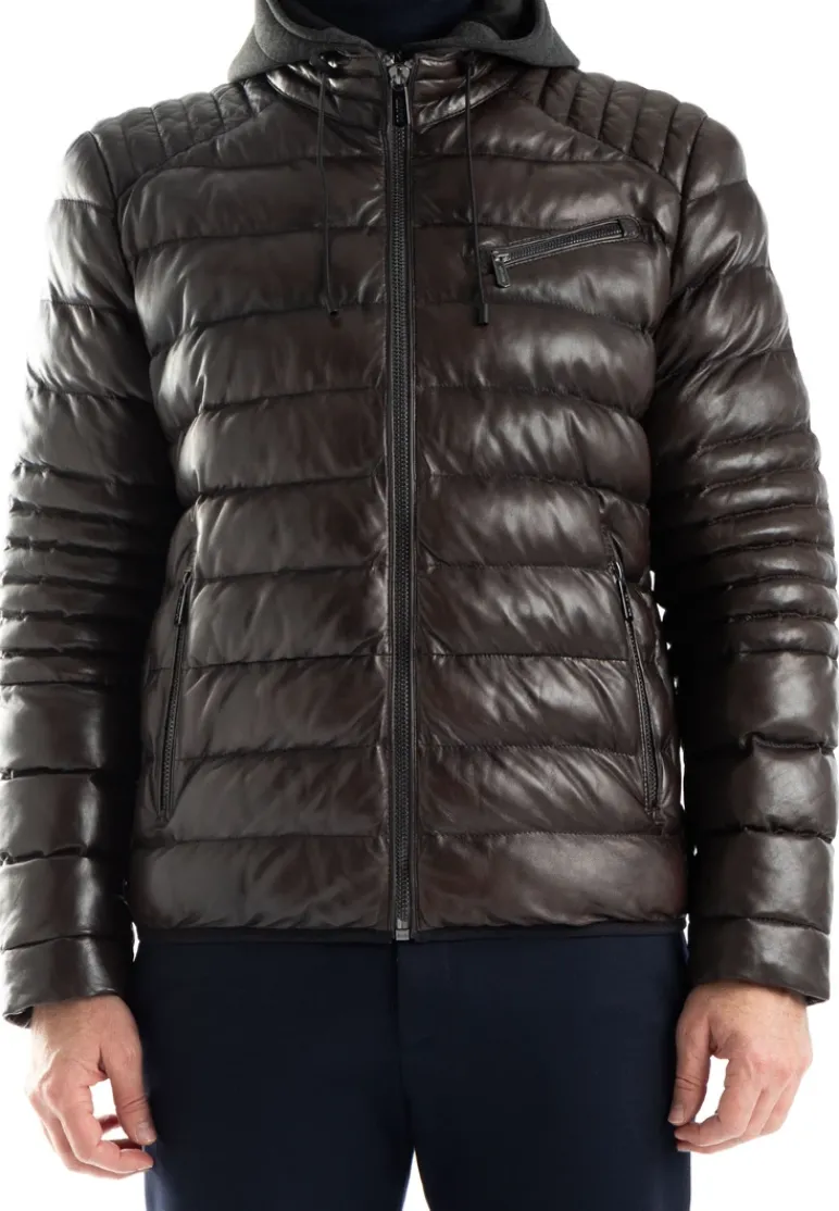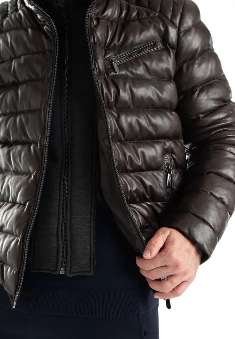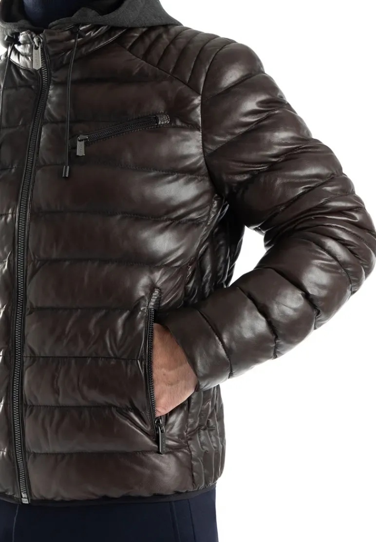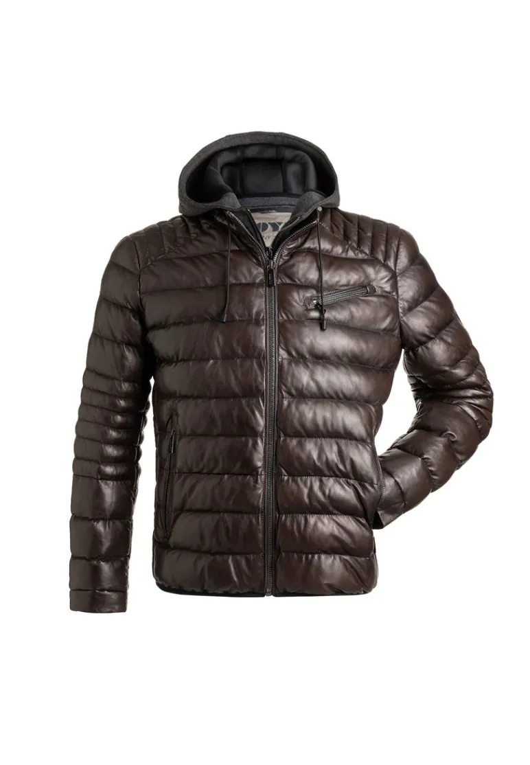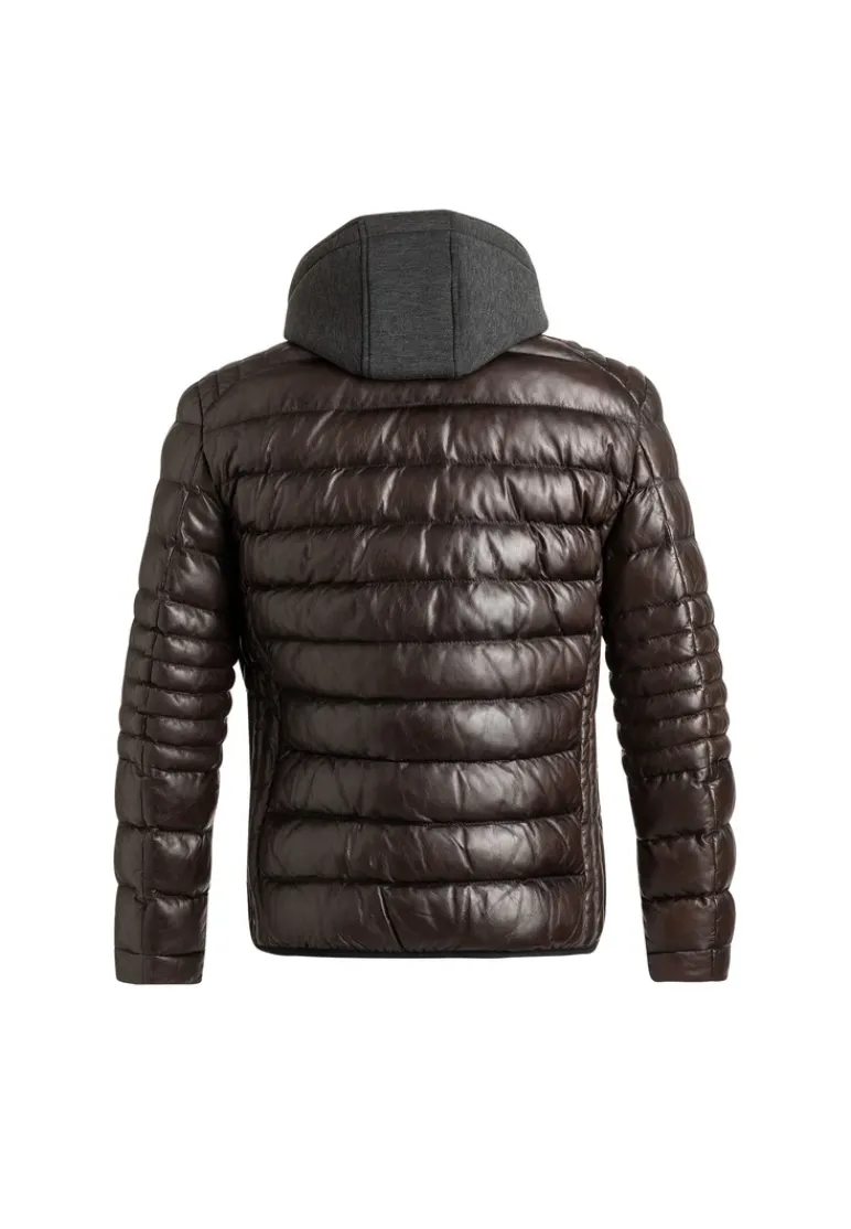 Discover the LLOYD quilted jacket made from sheep leather with a detachable inner panel and hood in jersey melange. This jacket features a high collar and robust zippers. Practical elements include side zippered front pockets and a chest pocket with a zipper. Inside, it offers two zippered pockets and an open pocket. The sustainable Dupont Sorona Aura insulation provides warmth and comfort during colder seasons. The model is 1.87 metres tall and wears a size 50.n
