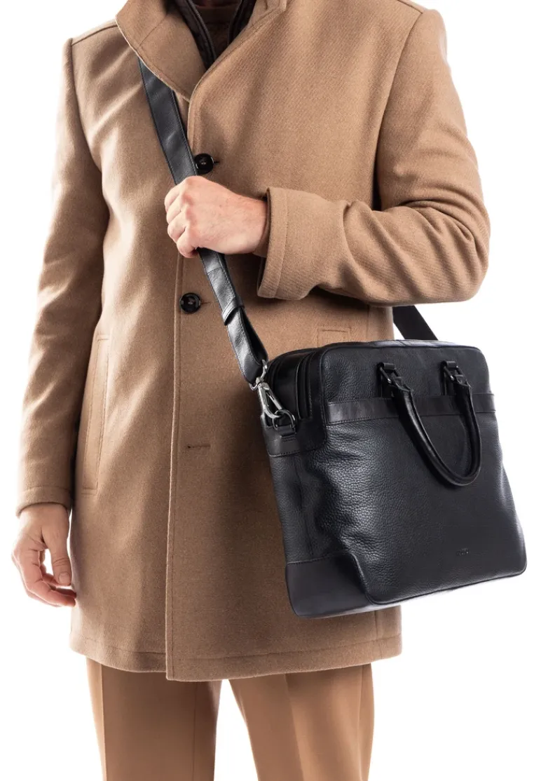 Measuring 45 x 30 x 10 cm, the Briefbag is an elegant and functional companion for everyday work. Equipped with short handles and an adjustable, detachable shoulder strap, it offers flexible carrying options.nThere is a practical zip compartment on the front, while the back has another zip compartment with an integrated trolley handle, ideal for travelling.nThe bag has two main compartments with two-way zips. The first compartment contains a laptop compartment and an additional slip pocket, while the second compartment with two slip pockets, two pen compartments and a zip pocket offers optimum storage space for various items. This cleverly designed briefcase combines stylish design with high functionality.