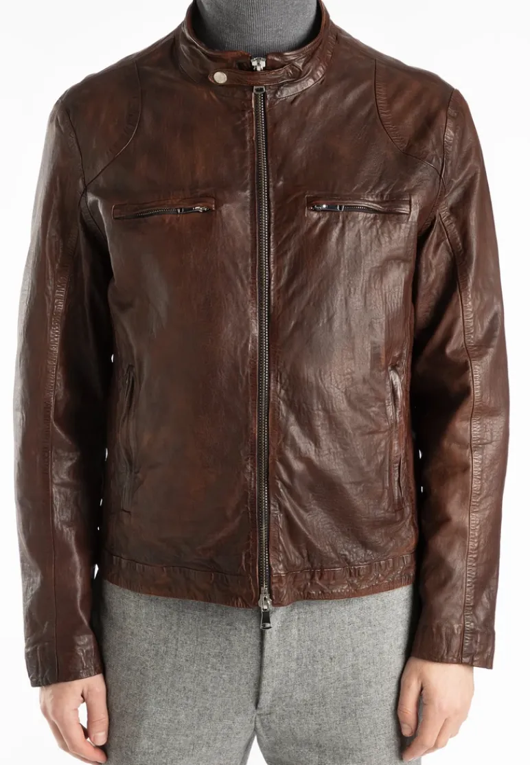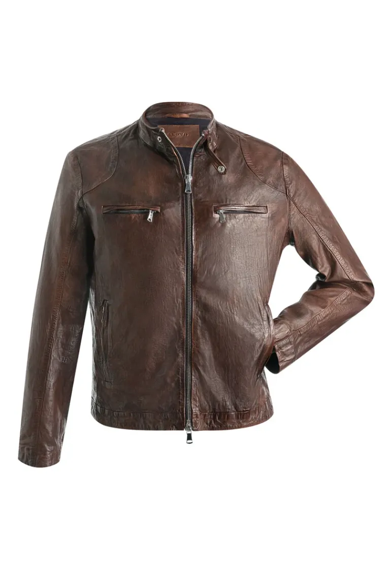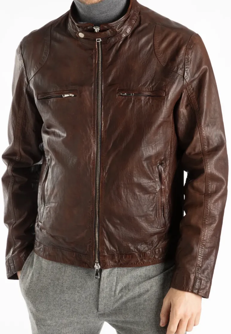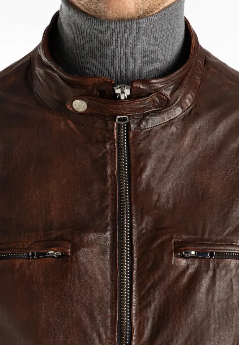 The “FARO” men’s jacket from LLOYD is a casual leather jacket with biker details made from lamb leather. It features elasticated leather inserts for a comfortable fit, a narrow stand-up collar with press stud tabs, breast pockets with zips and slanted zipped front pockets. There is a zip pocket and two slit pockets on the inside.
