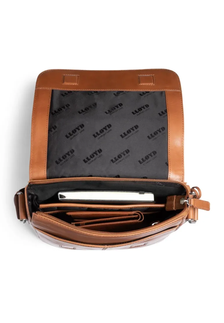 Discover the small messenger bag from LLOYD, made from grained leather with an adjustable shoulder strap and versatile compartments, including a horizontal and vertical zip pocket on the back. The bag features a leather trolley handle for added convenience when travelling and a main zipped compartment with space for tablets, two zipped compartments and a key ring pendant. Measuring 23 x 26 x 6 cm, this messenger bag is perfect for busy everyday life and offers enough space for your daily essentials.
