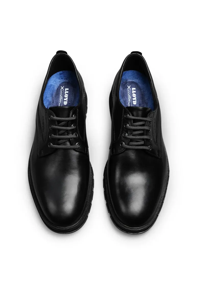 The LLOYD lace-up shoes made with black smooth leather feature a sporty design. In these shoes, a classic and elegant look is a given. A non-slip rubber sole cushions the impact when walking. Thanks to the low block heel the shoes offer secure footing and allow comfortable day-to-day wear. The shoes’ soft smooth leather upper and laces ensure a classic, elegant look and a firm, secure grip. These men’s lace-up shoes are breathable and comfortable by use of the leather lining. With this Variofootbed, the model is ideally suited for the use of inlays thanks to the removable insole.