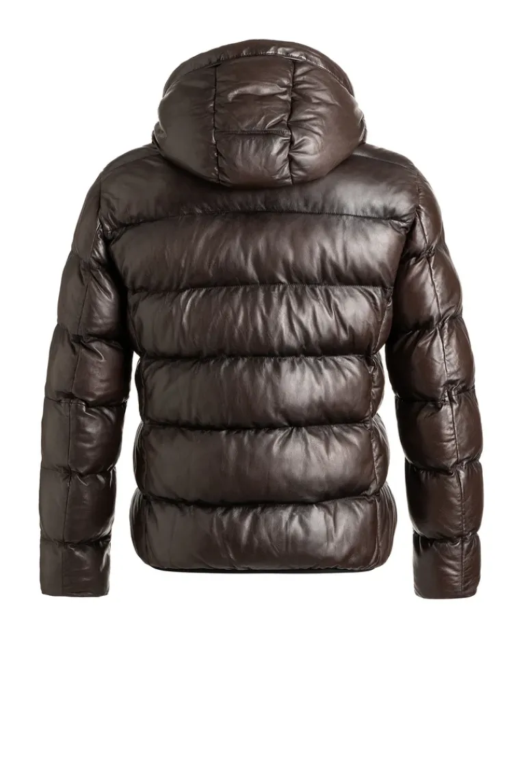 Discover the heavily padded quilted jacket made from sheep leather by LLOYD. This jacket features a high collar and a removable hood with adjustable width. Practical elements include front pockets with zippers and sturdy zippers. Inside, it offers two zippered pockets and an open pocket. The padding is processed in a chamber system and is made from sustainable Dupont Sorona Aura insulation. The model is 1.87 m tall and wears a size 50.n